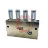 Cada saída contém um parafuso regulador de ar para regulagem da pulverização. Esse tipo de distribuidor é muito utilizado em rolamentos de alta rotação e spindle de máquinas CNC.